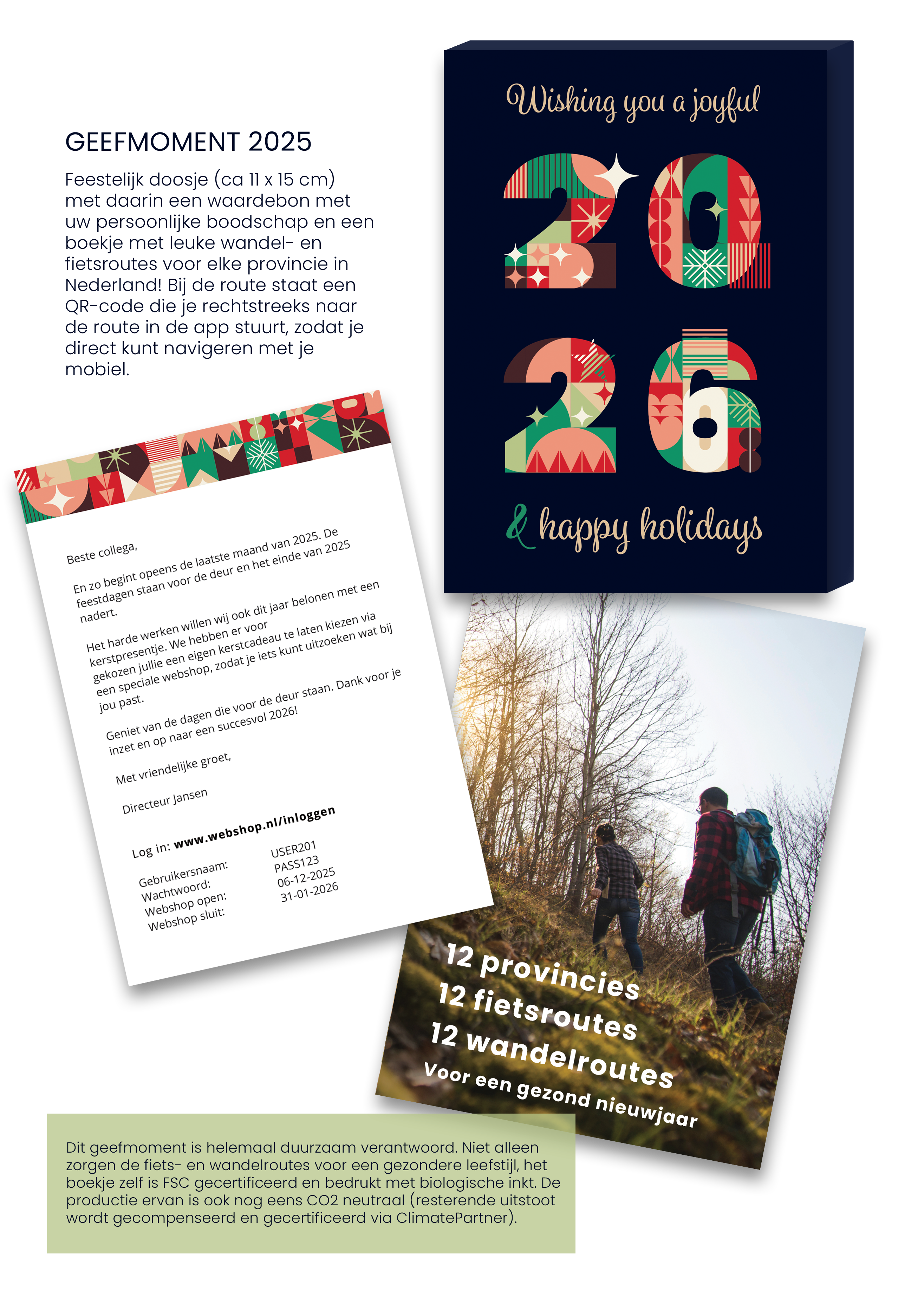 Dit geefmoment is helemaal duurzaam verantwoord. Niet alleen zorgen de fiets- en wandelroutes voor een gezondere levensstijl, het boekje zelf is FSC gecertificeerd en bedrukt met biologische inkt. De productie ervan is ook nog eens CO2 neutraal (resterende uitstoot wordt gecompenseerd en gecertificeerd via ClimatePartner).